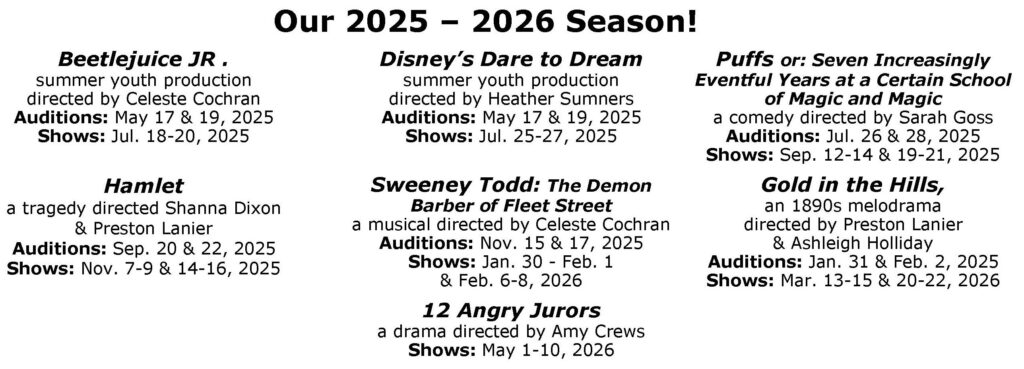 Our main-stage season includes Puffs or: Seven Increasingly Eventful Years at a Certain School of Magic and Magic, Sep. 12-14 & 19-21, 2025; Hamlet, Nov. 7-9 & 14-16, 2025; Sweeney Todd: The Demon Barber of Fleet Street, Jan. 30 – Feb. 1 & Feb. 6-8, 2026; and 12 Angry Jurors, May 1-3 & 8-10, 2026.