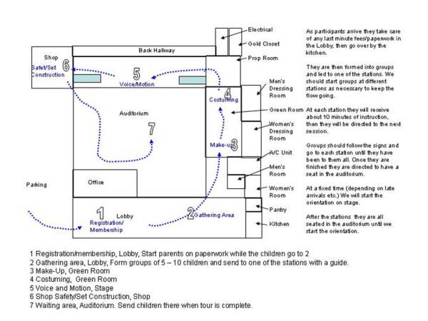Orientation will start at 1:00pm May 13th! See the orientation plan below. As children and their parents arrive the parents will start any paperwork needed while the children are formed into small groups and led by a guide to one of the stations. (They may not all start with the first station if several groups are formed at the same time, but the guides will make sure they get to all stations.) The groups will go to make-up, costume, voice/motion and shop areas for ~10minutes of instruction at each. When they are finished they will go to the auditorium and wait for orientation to start. The people scheduled to work are: